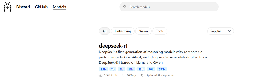 - Deschideți interfața Ollama, apoi accesați Modele și alegeți DeepSeek R1.
