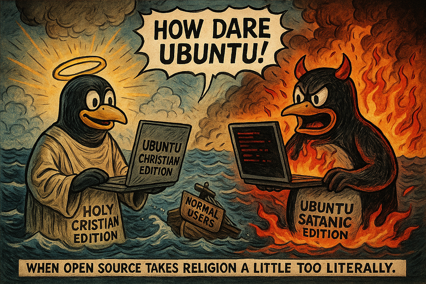 Știi că Linux a deraiat atunci când pornirea sistemului de operare pare o declarație teologică. Pe de o parte, ai Ubuntu Satanic Edition completă cu accente roșu-sânge, coloane sonore metal și un ecran de pornire care arată ca coperta unui album Slayer respins. Pe de altă parte, Ubuntu Christian Edition vine cu o Biblie digitală, instrumente de gestionare a bisericii și un filtru parental sănătos, astfel încât micii tăi dezvoltatori să nu ajungă să învețe scripturi shell de pe 4chan.